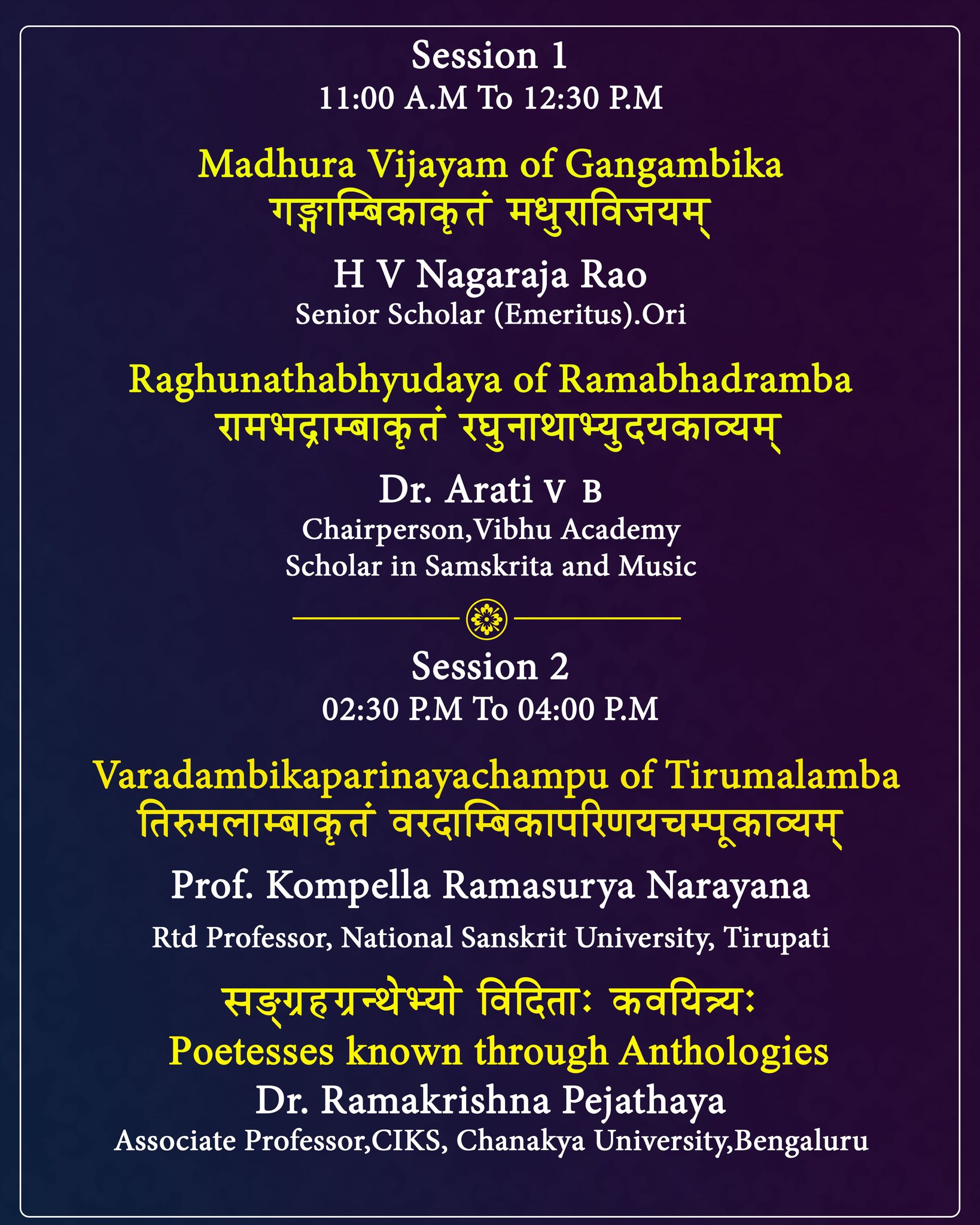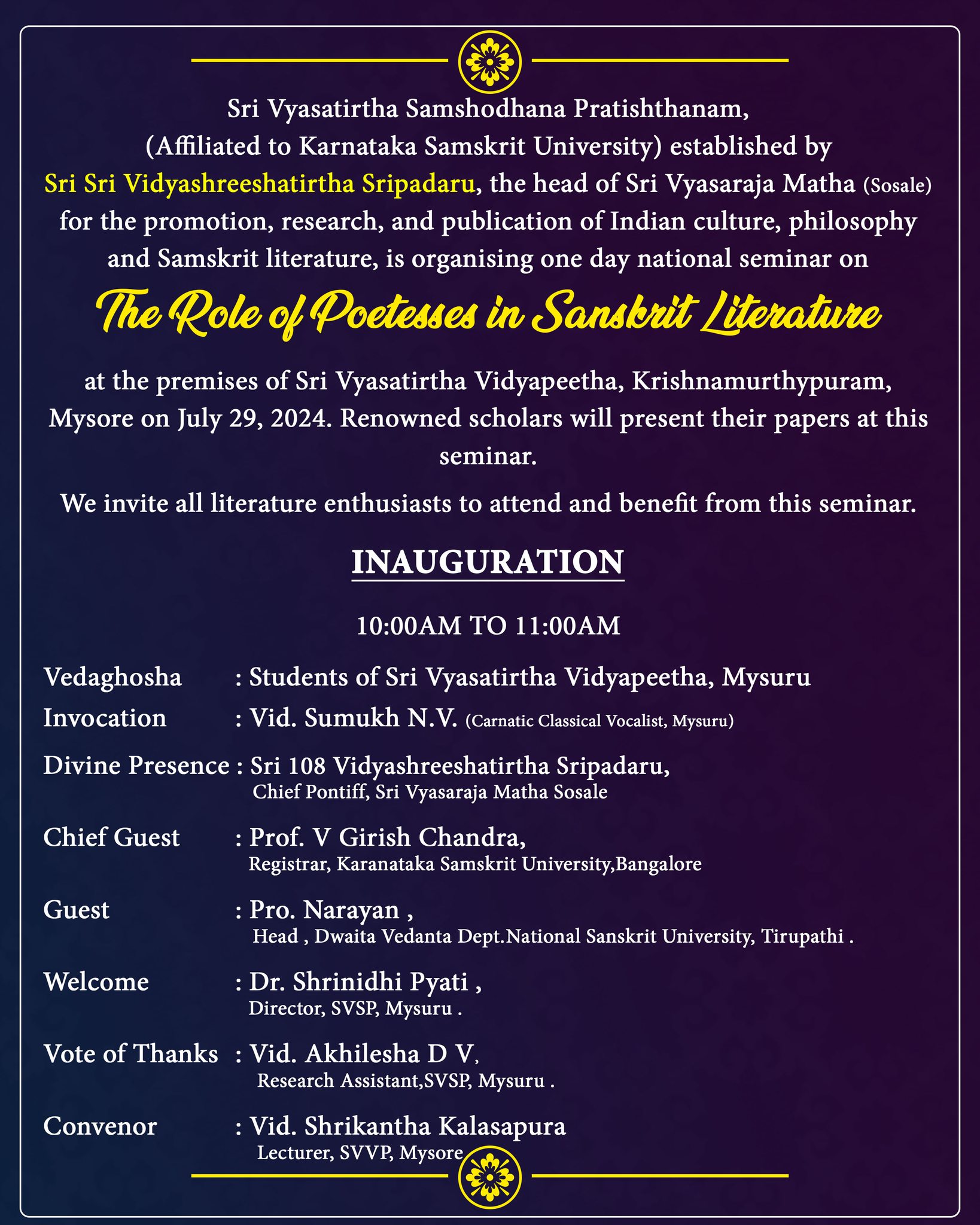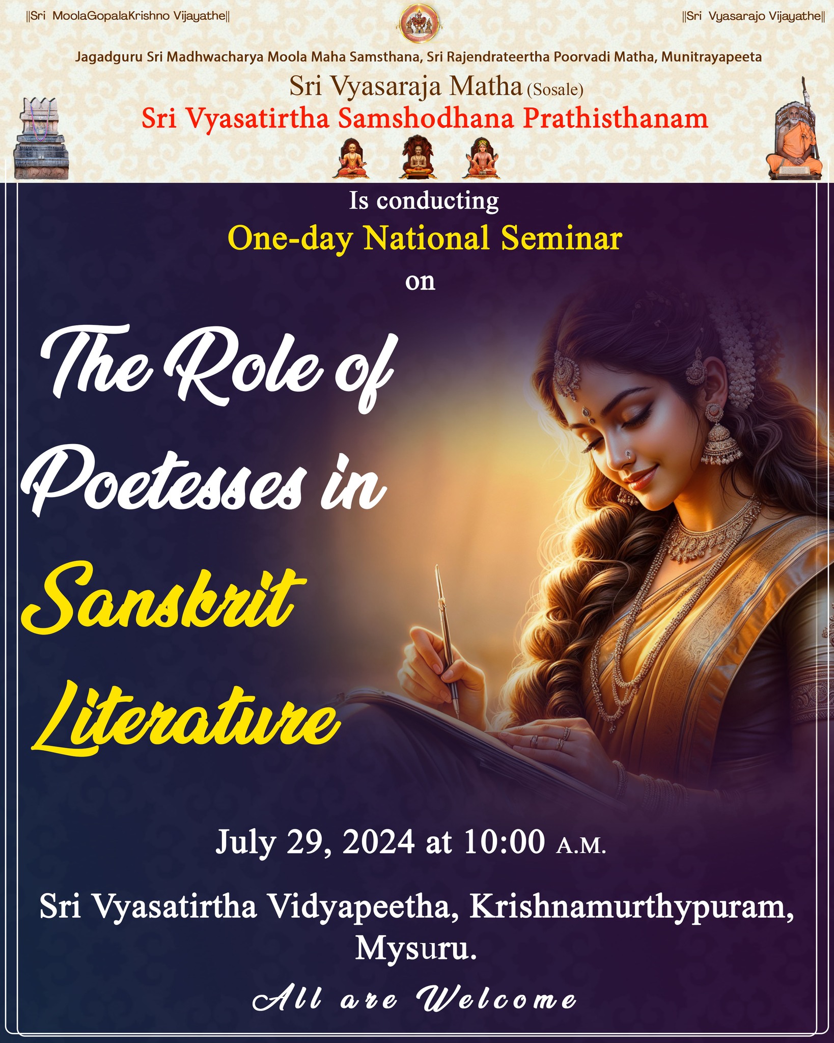 ಶ್ರೀವ್ಯಾಸರಾಜಮಠಾಧೀಶರಾದ ಶ್ರೀ ಶ್ರೀ ವಿದ್ಯಾಶ್ರೀಶತೀರ್ಥ ಶ್ರೀಪಾದರಿಂದ ಭಾರತೀಯ ಸಂಸ್ಕೃತಿ, ತತ್ತ್ವಶಾಸ್ತ್ರ ಮತ್ತು ಸಂಸ್ಕೃತ ಸಾಹಿತ್ಯದ ಪ್ರಚಾರ,ಪ್ರಸಾರ ಹಾಗು ಗ್ರಂಥ ಸಂಶೋಧನೆ ಹಾಗೂ ಪ್ರಕಾಶನದ ಉದ್ದೇಶದಿಂದ ಸ್ಥಾಪಿತವಾದ , ಶ್ರೀ ವ್ಯಾಸತೀರ್ಥ ಸಂಶೋಧನ ಪ್ರತಿಷ್ಠಾನ ವತಿಯಿಂದ (ಕರ್ನಾಟಕ ಸಂಸ್ಕೃತ ವಿಶ್ವವಿದ್ಯಾಲಯದಿಂದ ಮಾನಿತ), "ಸಂಸ್ಕೃತ ಸಾಹಿತ್ಯದಲ್ಲಿ ಕವಯಿತ್ರಿಯರ ಪಾತ್ರ"* ಎಂಬ ವಿಷಯದ ಕುರಿತಾಗಿ ಏಕದಿನ ರಾಷ್ಟ್ರೀಯ ಸಮ್ಮೇಳನವನ್ನು ಆಯೋಜಿಸಲಾಗುತ್ತಿದೆ. ಈ ಸಮ್ಮೇಳನವು ಜುಲೈ 29, 2024 ರಂದು ಶ್ರೀವ್ಯಾಸತೀರ್ಥ ವಿದ್ಯಾಪೀಠ, ಕೃಷ್ಣಮೂರ್ತಿಪುರಂ, ಮೈಸೂರು ನಲ್ಲಿ ನಡೆಯಲಿದೆ. ಪ್ರಸಿದ್ಧ ಪಂಡಿತರು ತಮ್ಮ ಪ್ರಬಂಧಗಳನ್ನು ಈ ಸಮ್ಮೇಳನದಲ್ಲಿ ಮಂಡಿಸಲಿದ್ದಾರೆ. ಎಲ್ಲ ಸಾಹಿತ್ಯ ರಸಿಕರು ಈ ಸಮ್ಮೇಳನದಲ್ಲಿ ಭಾಗವಹಿಸಿ ಮತ್ತು ಇದರ ಲಾಭ ಪಡೆಯಬೇಕೆಂದು ವಿನಂತಿಸುತ್ತೇವೆ. Sri Vyasatirtha Samshodhana Pratishthanam,(Affiliated to Karnataka Samskrit University) established by Sri Sri Vidyashreeshatirtha Sripadaru, the head of Sri Vyasaraja Matha (Sosale) for the promotion, research, and publication of Indian culture, philosophy and Samskrit literature, is organising one day national seminar onThe Role of Poetesses in Sanskrit Literature at the premises of Sri Vyasatirtha Vidyapeetha, Krishnamurthypuram, Mysore on July 29, 2024.